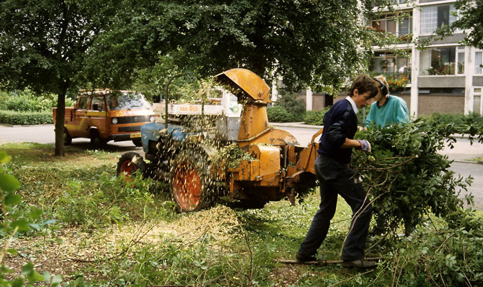 | In de jaren tachtig van de vorige eeuw deed ook de versnipperaar zijn intrede. De snippers werden gebruikt om het onkruid te onderdrukken. Als de snippers egaal werden verspreid, zag het er niet onaardig uit, maar dat veranderde spoedig. Door de snelle mineralisatie van de houtsnippers en de te dikke lagen die werden aangebracht ontstonden er storingsvegetaties die werden gedomineerd door grote brandnetels en kleefkruid. Iedere ecoloog kon dat weten. Maar dat mocht je niet hardop zeggen. Als het een dunne laag van maximaal 2-3 cm in de schaduw was, ging het redelijk goed. Snoeihout pleksgewijs op enkele hopen gooien is ook een alternatief. Dikke lagen kunnen de bodem afsluiten voor zuurstof en op zonnige en half beschaduwde plekken leiden tot een explosieve groei van onkruiden. Afvoeren van de snippers is het beste. Houtsnippers kunnen bovendien als energiebron worden gebruikt. (Heerhugowaard, 2001). |