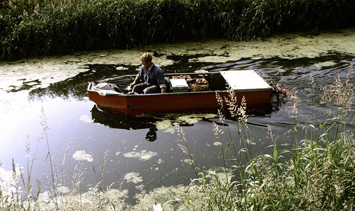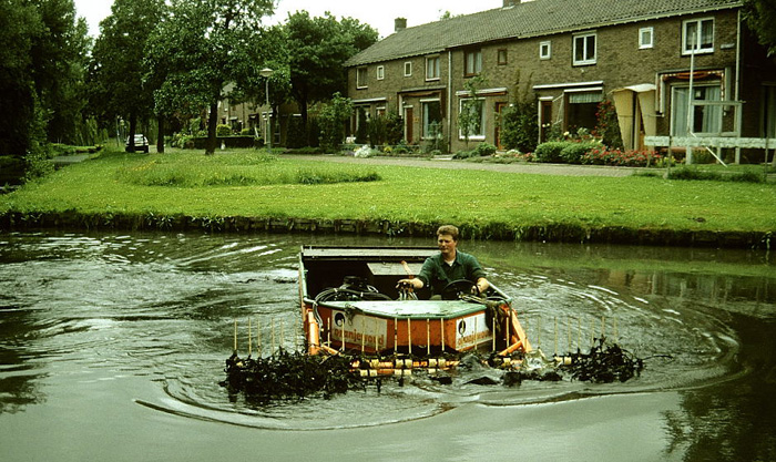 | Maaiboot -- Een maaiboot is uitgerust met een afstelbare maaibalk. De planten kunnen dus op iedere gewenste hoogte worden afgeknipt. Al het onderhoudswerk dat in het groeiseizoen plaatsvindt, is ingrijpend voor de fauna. Vergeleken met de veegboot is het inzetten van een maaiboot aanzienlijk beter. Waar drachtplanten met drijvende bladen talrijk voorkomen is deze beheermaatregel niet of minder noodzakelijk. Wat we bij de Adviesgroep Vegetatiebeheer adviseerde, was de randen van watergangen en vijvers met rust te laten. In ieder geval in het groeiseizoen, Niet alleen voor de flora, maar vooral ook voor de fauna. |