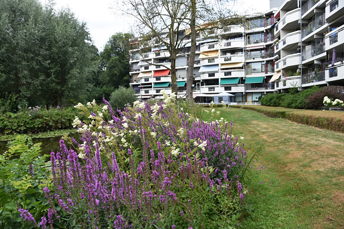 Een bloemrijke oever in Veenendaal: In steeds meer gemeenten komen zulke begroeiingen voor. Op vochtige grond kan op en paar vierkante meter deze plantencombinatie worden gerealiseerd. Wat hier groeit (Moerasspirea, Grote kattenstaart, koninginnekruid en andere planten. Dit zijn planten die ook goed in de tuin kunnen groeien, ze zaaien zich uit, maar zijn onder controle te houden. |