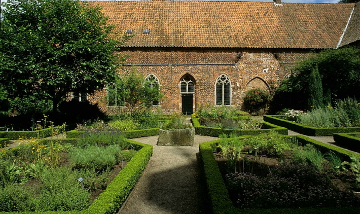 | Kloostertuin Ter Apel - Deze oude kloosterkruidentuin bevat meer dan 100 soorten kruiden. De meeste zijn tijdens de bloei ook goed voor wilde bijen. (Foto 1997). De tuin bestaat nog steeds. |