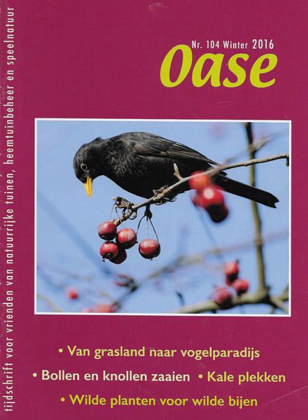 Lees voor meer informatie het kwartaalblad 'Oase' Dit praktijkblad is vooral gericht op natuurlijke tuinen of met andere woorden op biodiversiteit. Oase laat zien hoe je tuinen kan inrichten, hoe je bijen vinders, en andere dieren waaronder vogels kan aantrekken. In mijn visie zijn tuinen goudmijnen voor biodiversiteit. In Oase staat vaak hoe je dit goud kan delven. |