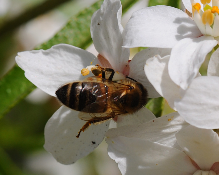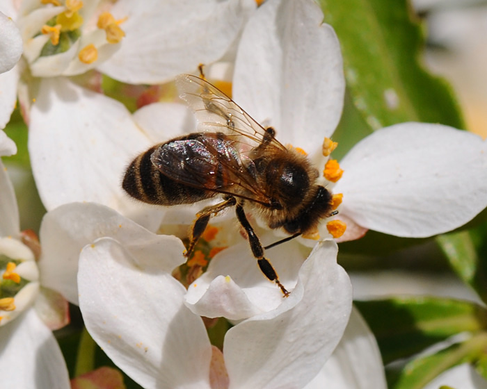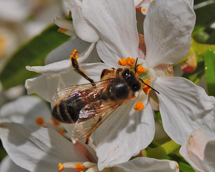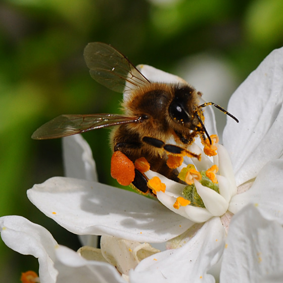 | Honingbij met oranje stuifmeel |