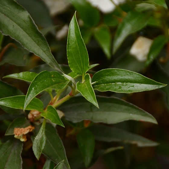 | Blad: langwerpig en naar de top toegespitst, iets leerachtig en aan de onderkant klierachtig behaard |