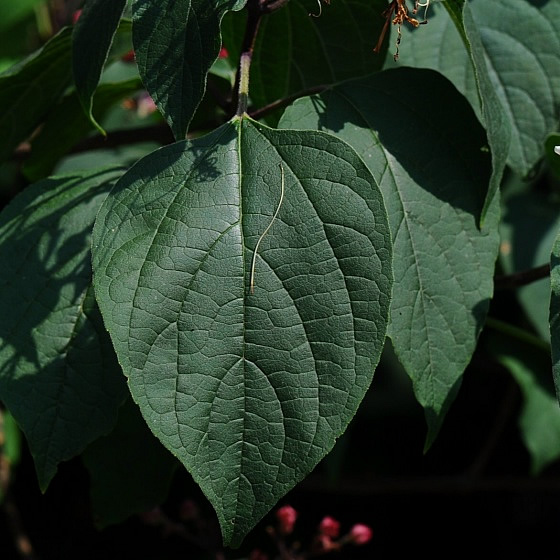 | Blad: eirond tot zwak hartvormig, aan jonge struiken sterker hartvormig; onderkant blad met verspreide klierharen |