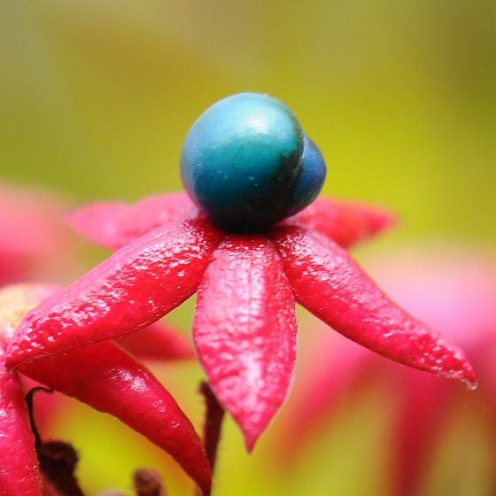 | Vrucht: een besvormige steenvrucht, staalblauwe splitvrucht, die is omringd met de uitstaande kelkbladen. De vrucht wordt op de bloembodem, onder in de bloembuis gevormd |