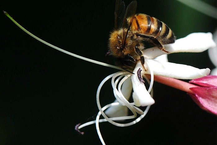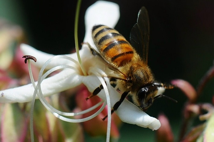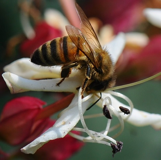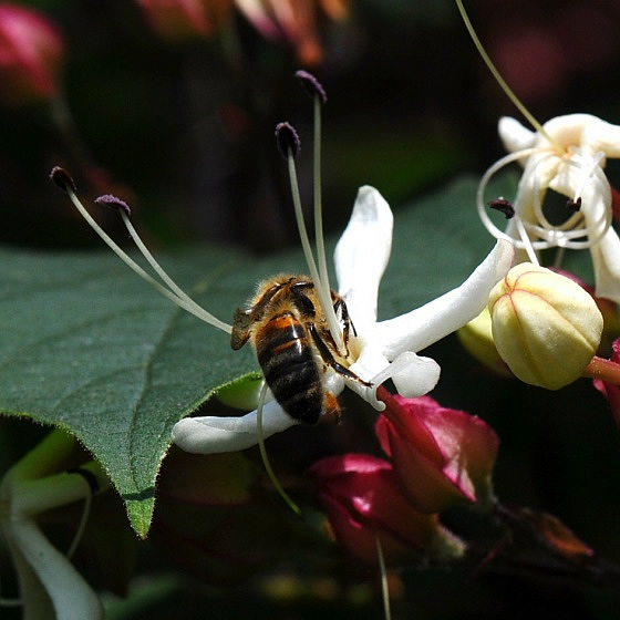 | Dracht: nectar (en stuifmeel ?). Indicatie voor dracht: code 1. Deze heester houd ik al 35 jaar in de gaten. Met uitzondering van een verdwaalde bij, heb ik tot augustus 2014 nooit honingbijen op de deze plant waargenomen. In de botanische tuin van Utrecht (in de Uithof), bezochten tientallen bijen de bloemen van deze heester. De bijen verzamelden alleen nectar. De afstand tot de bijenvolken bedroeg hemelsbreed ca. 25 m. Of deze plant als drachtplant moet worden aangeplant, is zeer de vraag. |