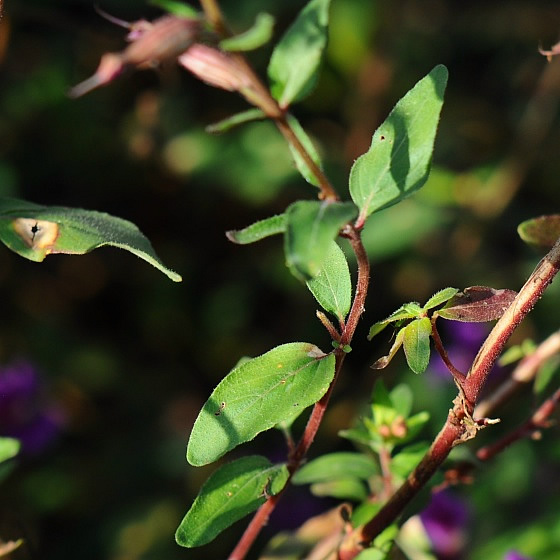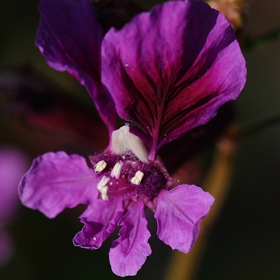 | Bloem: tweezijdig symmetrisch; roodpaars/purpper; kroonbladen 6 of 7de 2 bovenste aanzienlijk groter dan de onderste; kelk buisvormige en klierachtig behaard; bloeiwijze okselstandig |