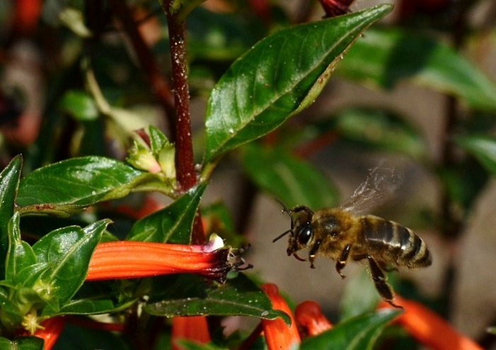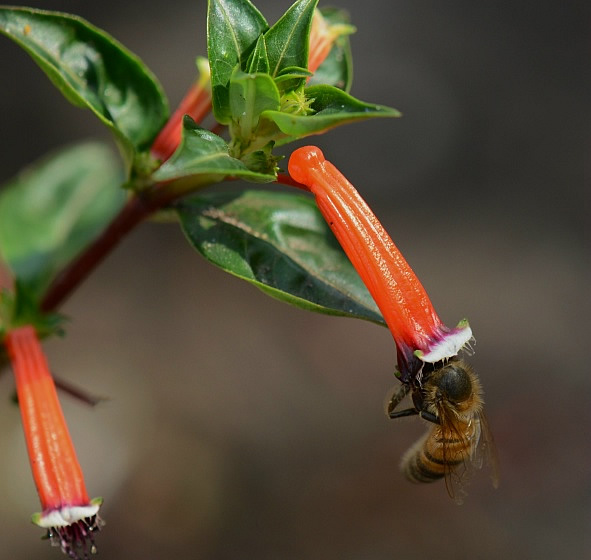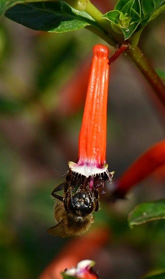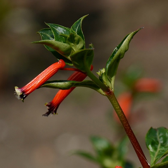 | Bloem: bloem rood tot oranje en buisvormig( de bloem is de kelkbuis met een korte kelkspoor), bloeiwijze okselstandig. |