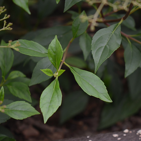 | Blad: tegenoverstaand, elliptisch tot langwerpig, bladrand zwak getand, |