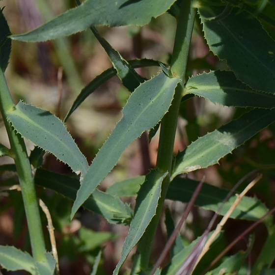 | Blad: in de onderste helft lang en smal en sterk toegespitst aan de top. Naar boven toe meer ovaal. De randen fijn gezaagd |