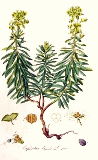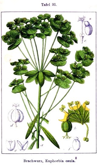| Platen heksenmelk - Euphorbia esula- (bron links: Deutschlands Flora in Abbildungen.Johann Georg Sturm; rechts: Flora Batavia Jan Kops et al.) |