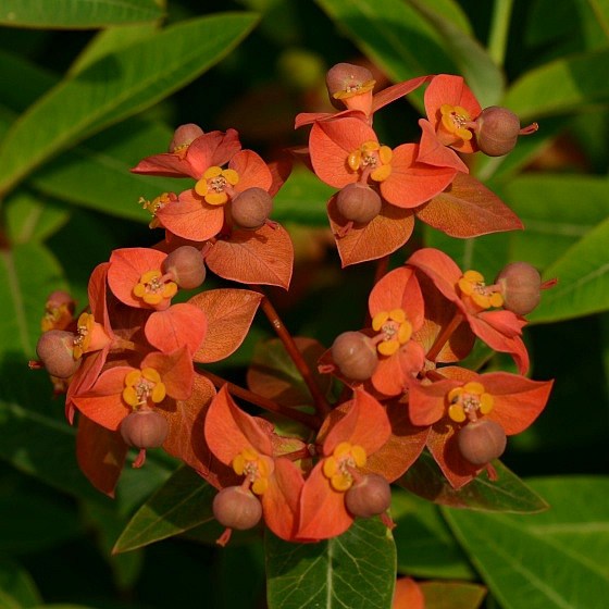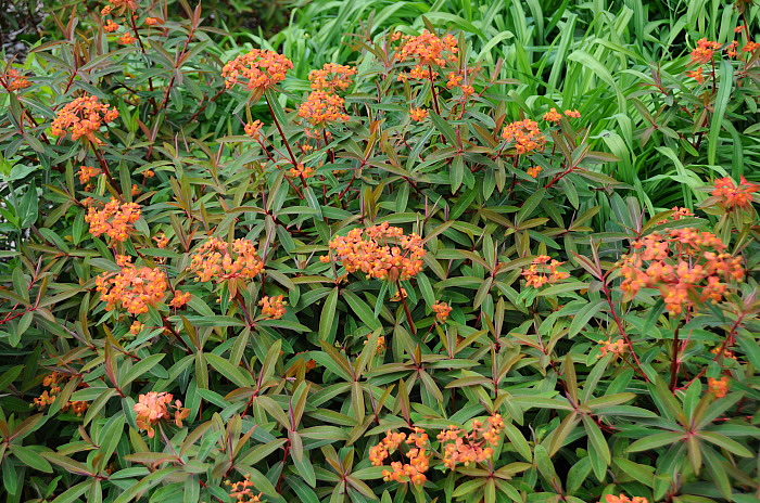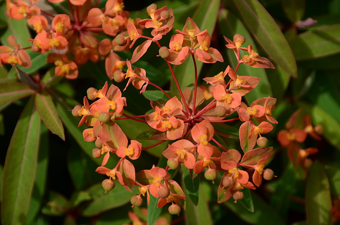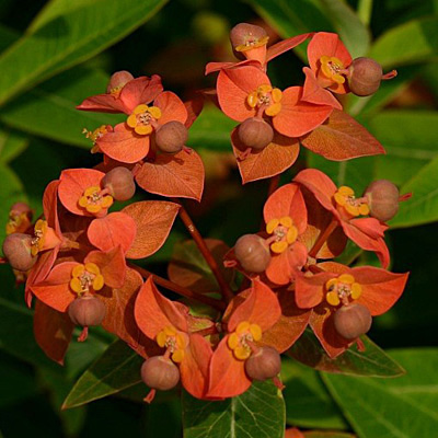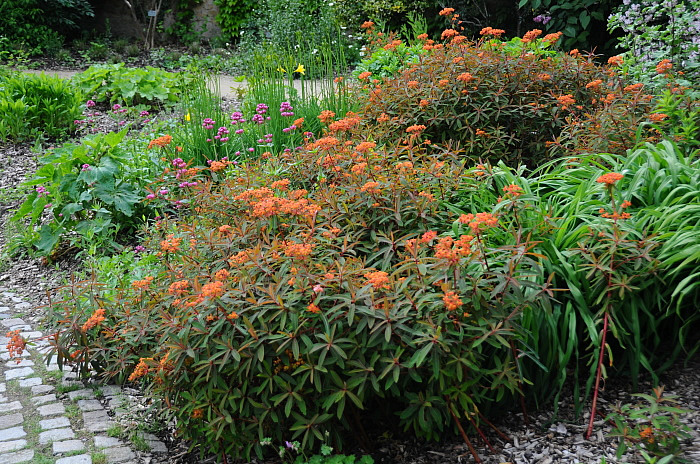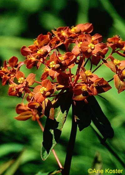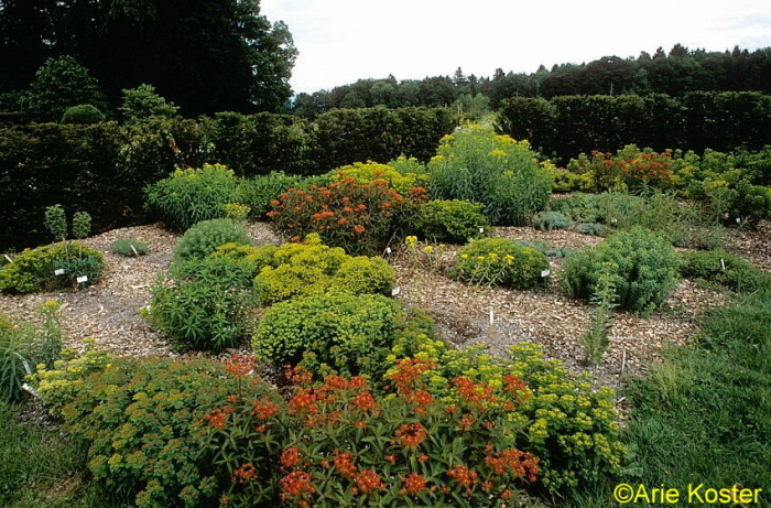 | Euphorbia's in de Proeftuin Hochschule Wädenswil (2002) Euphorbia griffithii met rode bloeiwijze. In deze tuin kwamen zandbijen talrijk op deze plant voor. |
