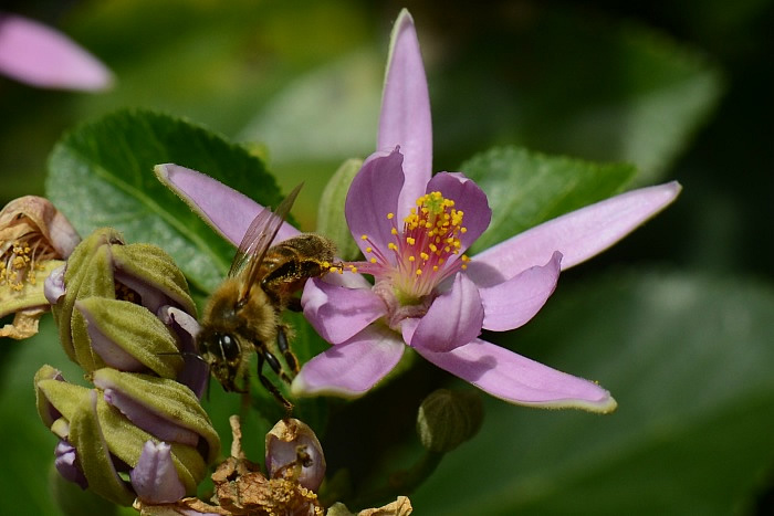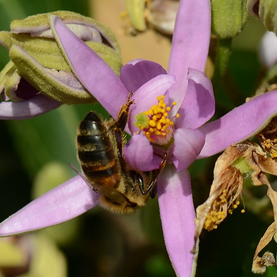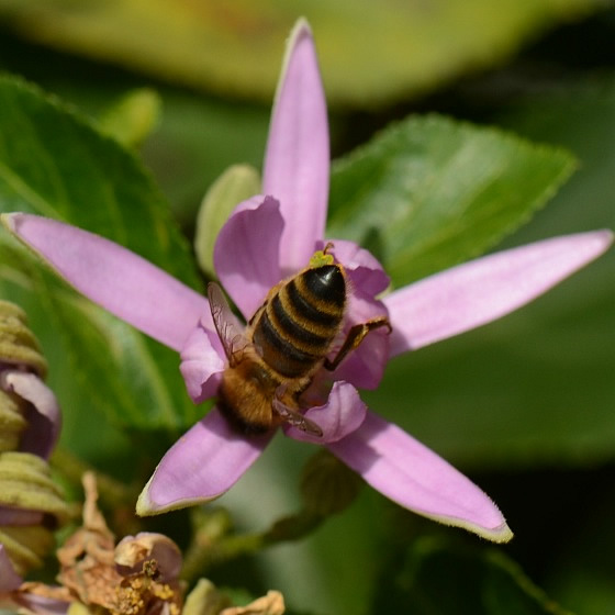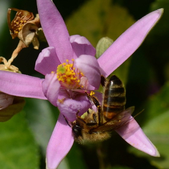 | Dracht: nectar (en stuifmeel ?). Indicatie voor dracht: code Hb1-3. Enkele honingbijen waargenomen. Het lijkt er op dat net als bij linde en malva de nectarien aan de binnen kant van de kelkbladen liggen. |