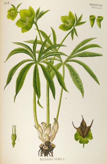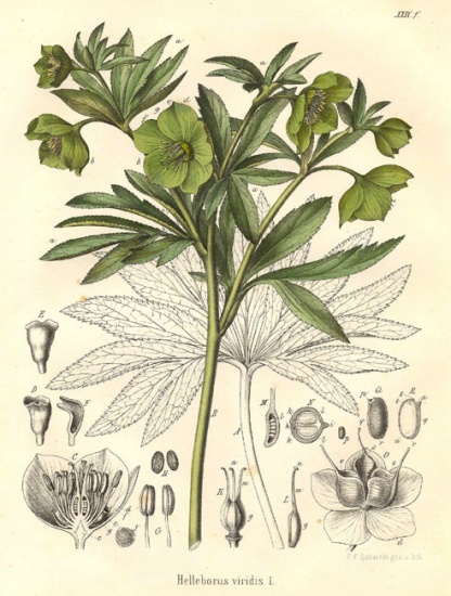 | Wrangwortel - Helleborus viridis- (bron Darstellung und Beschreibung sämtlicher in der Pharmacopoea Borusica aufgeführten offizinellen Gewächse by Otto Carl Berg & Carl Friedrich Schmidt.) |