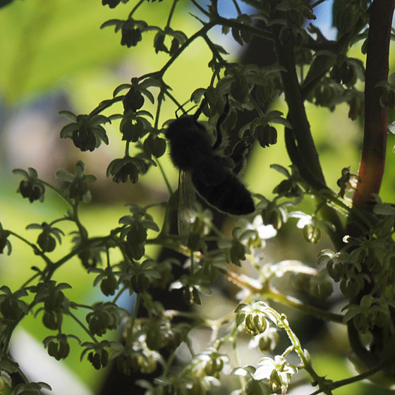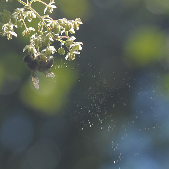 | Als bij windstil weer de bij op de bloem land, sneeuwt het stuifmeel |