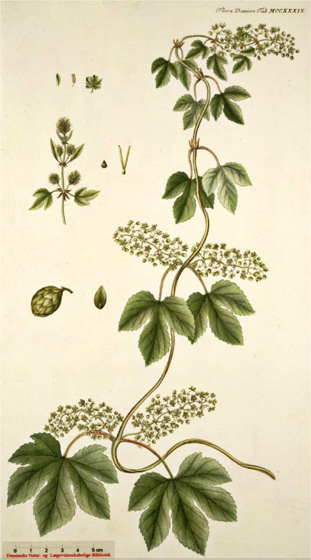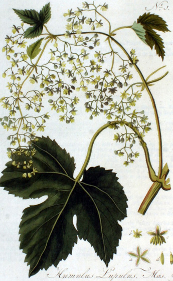| Bloem: tweehuizige plant: bloeiwijze: de mannelijke bloemen in wijde trossen, de vrouwelijke leveren de hopbellen. |