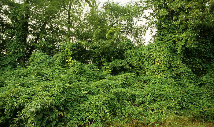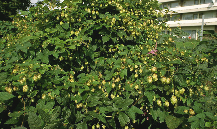 | Een beplanting met een overwoekering v an hop: hier 5 m hoog en veel breder (15-20m) dan op de foto |