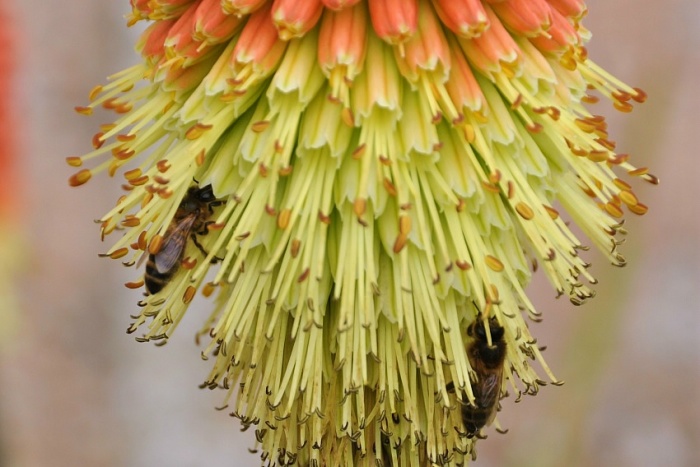 : oranjegeel-rood, bloeiwijze een aarachtige tros, bloemen min of meer hangend
