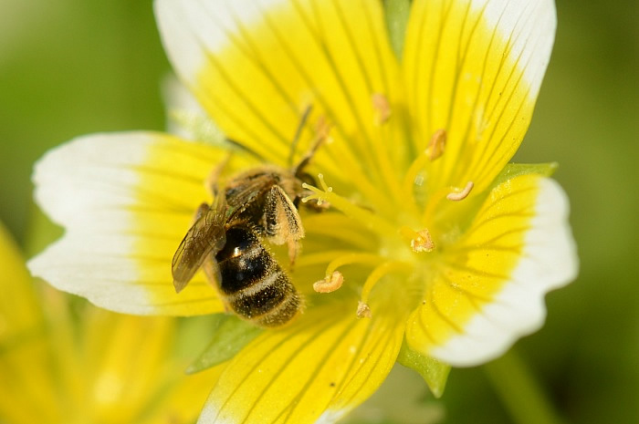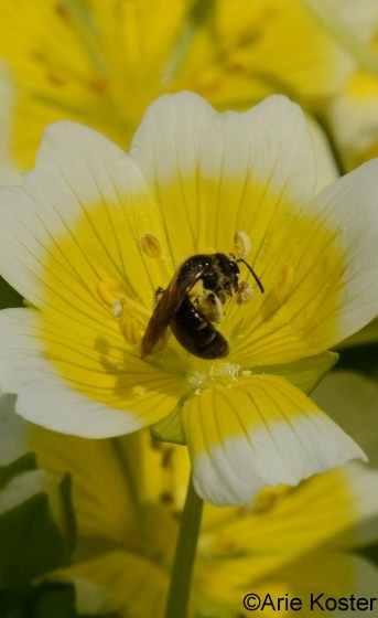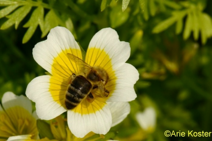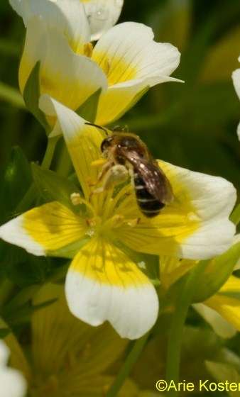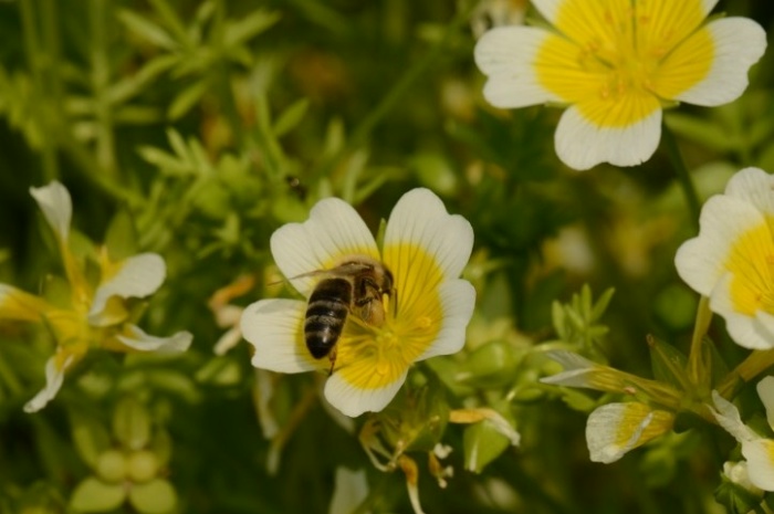 | Honingbij op geelwitte moerasbloem- Limnanthes douglasii  - |