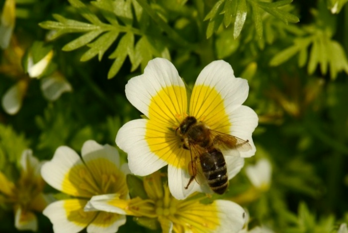 | Donzigige moerasbloem Limnanthes alba  wordt in tuinen minder  toegepast: verschil met geelwitte moerasbloem: kroonbladen wit, na de bloei niet teruggeslagen, jonge bladen donzig behaard. De toepassing in tuinen en voor bijen ongeveer gelijk. |