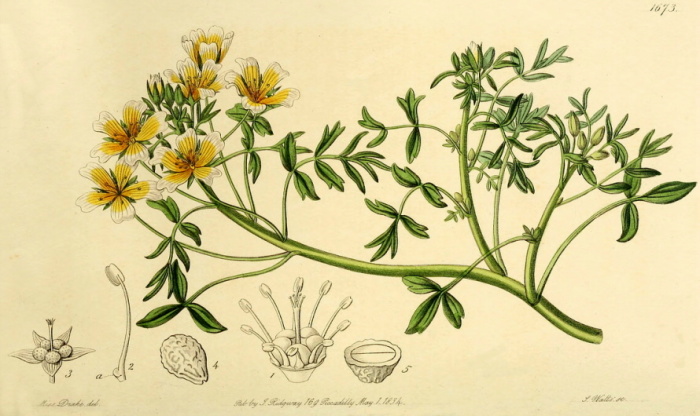 | Geelwitte moerasbloem- Limnanthes douglasii (bron: Watson, L.,  and Dallwitz, M.J. 1992 onwards. The families of flowering plants:  descriptions, illustrations, identification, and information retrieval.  Version: 4th March 2011.