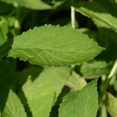 | Blad: langwerpig tot eirond en met onregelmatige gekartelde/getande bladrand; blad behaard. |