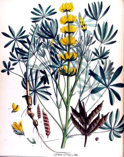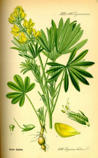 | Platen Gele lupine - Lupinus luteus - (bron : O.W. Thomé Flora von Deutschland, Österreich und der Schweiz) |