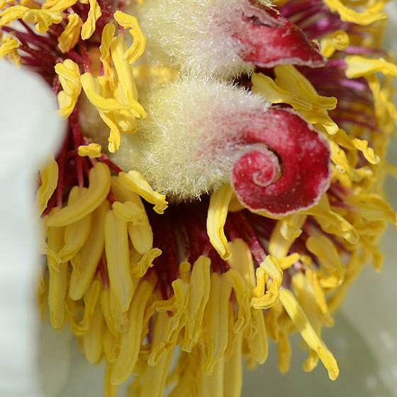 | Vruchtbeginsel ( de rode, harige krul) ontwikkelt zich tot een kokervrucht |