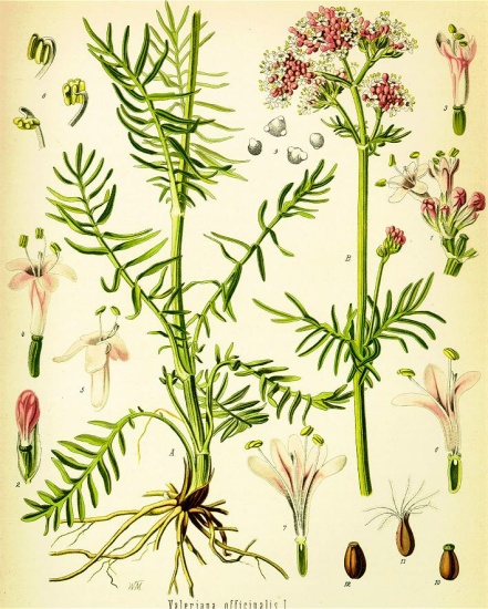 | Platen echte valeriaan - (bron links: Franz Eugen Köhler, Köhler's Medizinal-Pflanzen) |