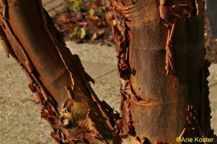 twijgen bruinachtig en glad; stam en dikke takken met opvallende bruine, papierachtige afschilferende bast zoals bij papierberk