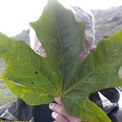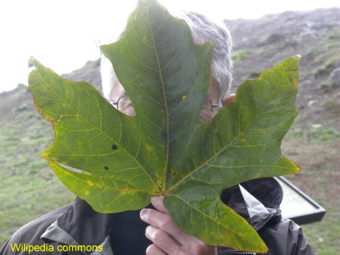 | Blad: zeer groot 20-30 (40) cm lang en met gegolfde bladrand, handvormig gelobd met 5 (7)lobben, bovenkant blad glanzend donker groen, de onderkant blauwachtig groen, beide kanten van de jonge bladen dicht en kort behaard, de steel bevat melksap, herfstkleur geel |