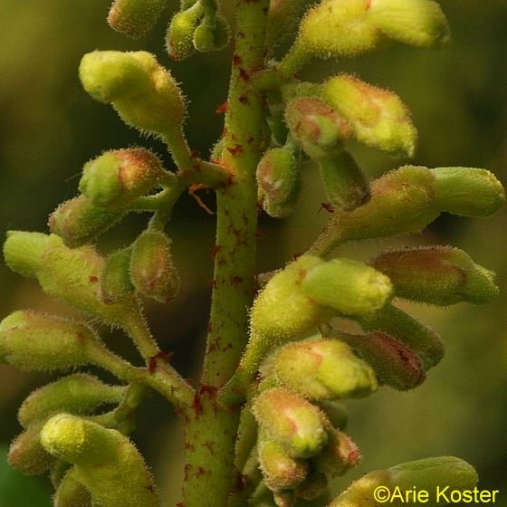 | Bloem: geel, bloeiwijze een trosvormige opstaande, klierachtig behaarde pluim, bloemstelen groen, knoppen niet kleverig |