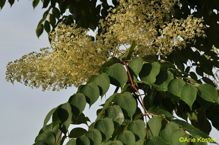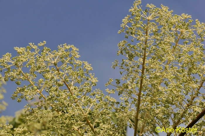 | Bloem: roomwit, tot 0,5m diam, bloeiwijze een afgeplatte pluim die uit kleine bloeischermen is samen gesteld |