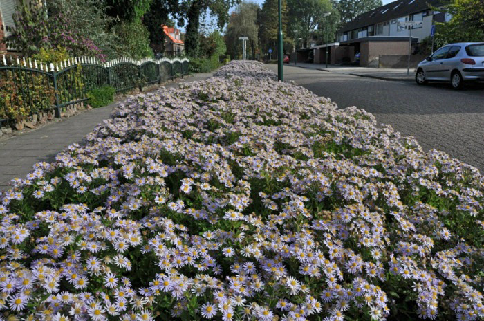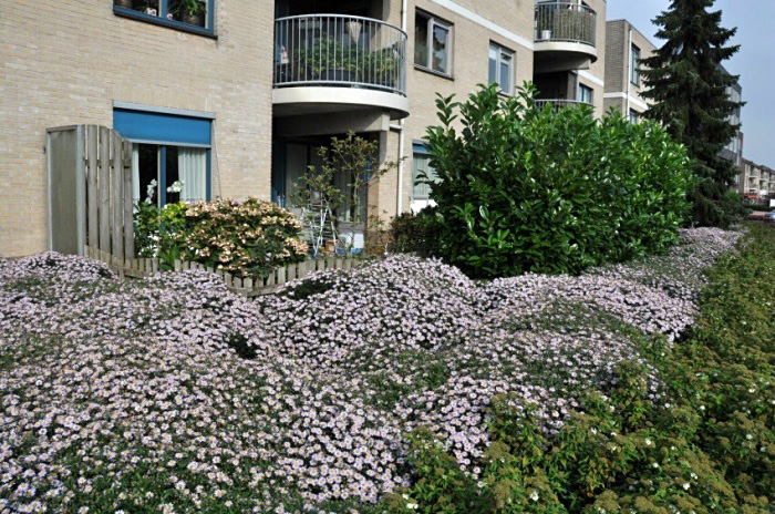| Plantsoen2: de beplanting met aster is doorgetrokken langs de blinde muur |