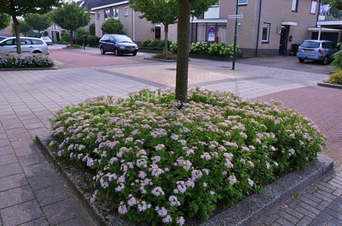 | Toepassing: In tuinen; openbaar groen zoals boomspiegels, afscheidingsstroken, plantsoenen en andere soorten beplantingsvakken. Vormt zeer dichte begroeiingen en een zeer massieve bloei. In Veenendaal is deze soort op veel plaatsen toegepast. zie foto's. |