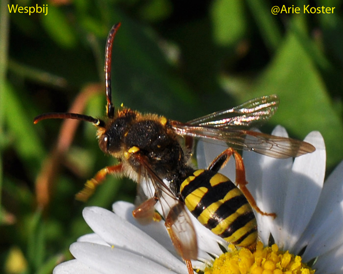 | Een van de wespbijen met een rood en zwak geel gevlekt achterlijf, lijkt op een bloedbij |