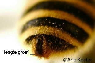 | Groefbijen (53): groefbijen lijken veel op zandbijen. De vrouwtjes zijn van alle andere geslachten te onderscheiden door een klein lengtegroefje in de punt van het achterlijf. |