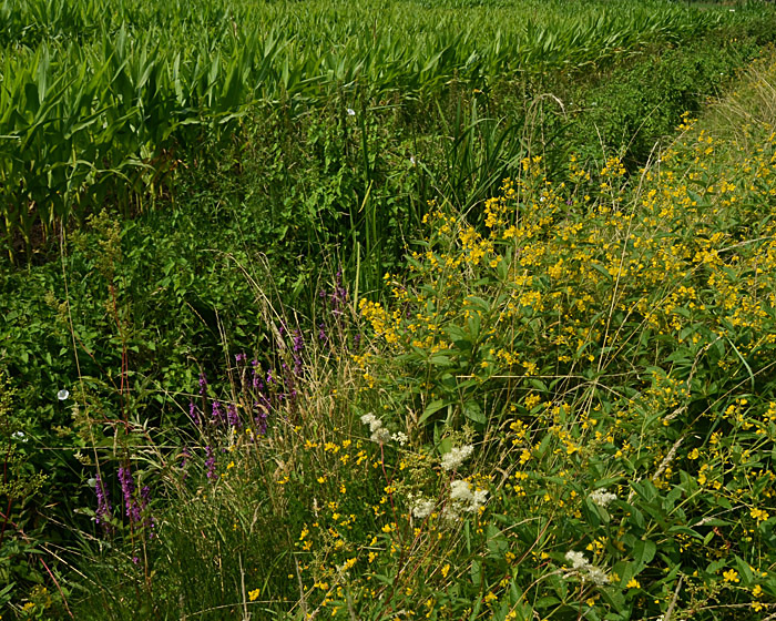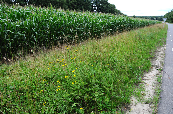 | Op het gebied van biodiversiteit en milieu hebben maïsakkers een niet al te beste naam. Op deze website zijn al veel voorbeelden gegeven van bloemrijke natuurlijke vegetaties langs maïsakkers. De vraag is nu wat levert dat op voor bijvoorbeeld wilde bijen en vlinders. In de eerste helft van augustus 2013 zijn terloops, tijdens werkzaamheden en fietstochten enkele steekproeven genomen. De resultaten van 2013 zijn niet spectaculair maar zeer zeker de moeite van het vermelden waard. Op 23 juli 2016 deed ik hetzelfde op andere locaties in de Gelderse Vallei in de omgeving van Veenendaal. Dit keer werden ook sterk gespecialiseerde bijen waargenomen. De plekken die zijn bezocht maken officieel geen deel uit van de akker, maar liggen er pal naast. |
