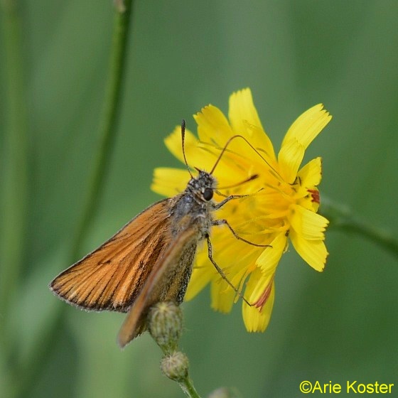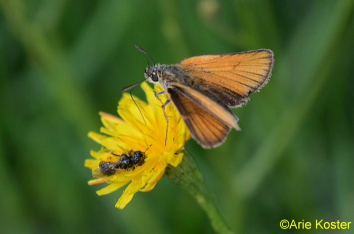 | Een dikkopje met kleine roetbij op gewoon biggenkruid |