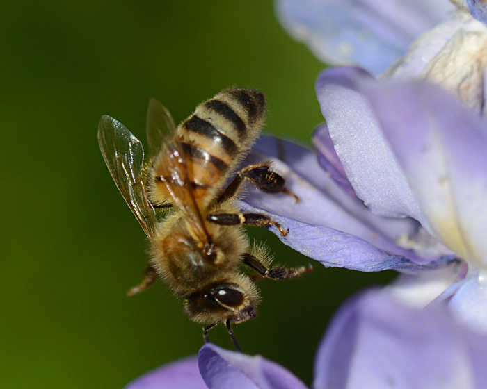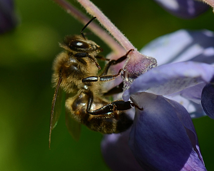 | Honingbij met zijn monddelen bij de bloemkelk |